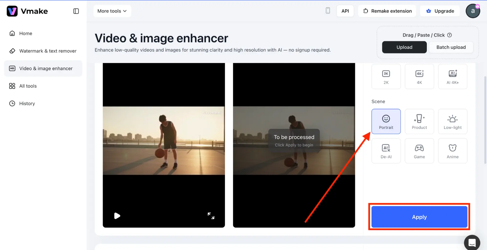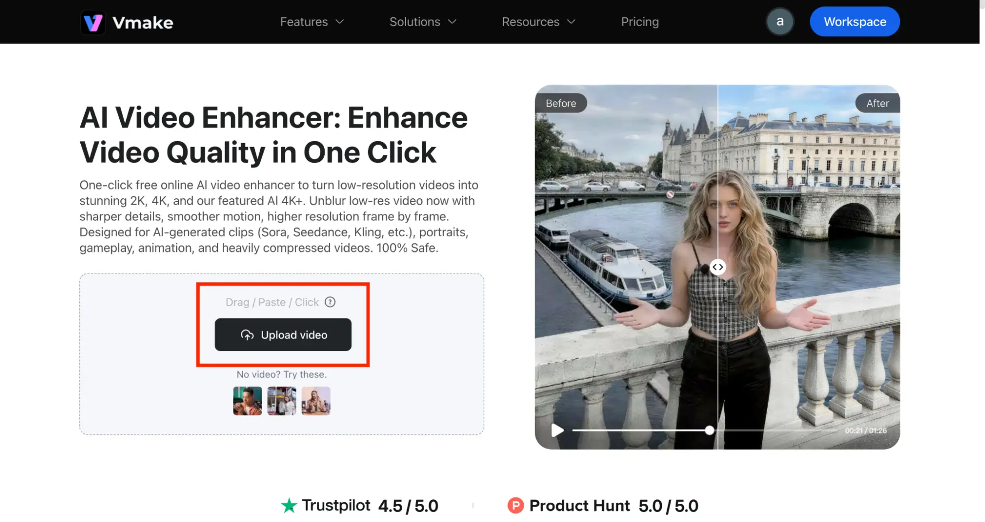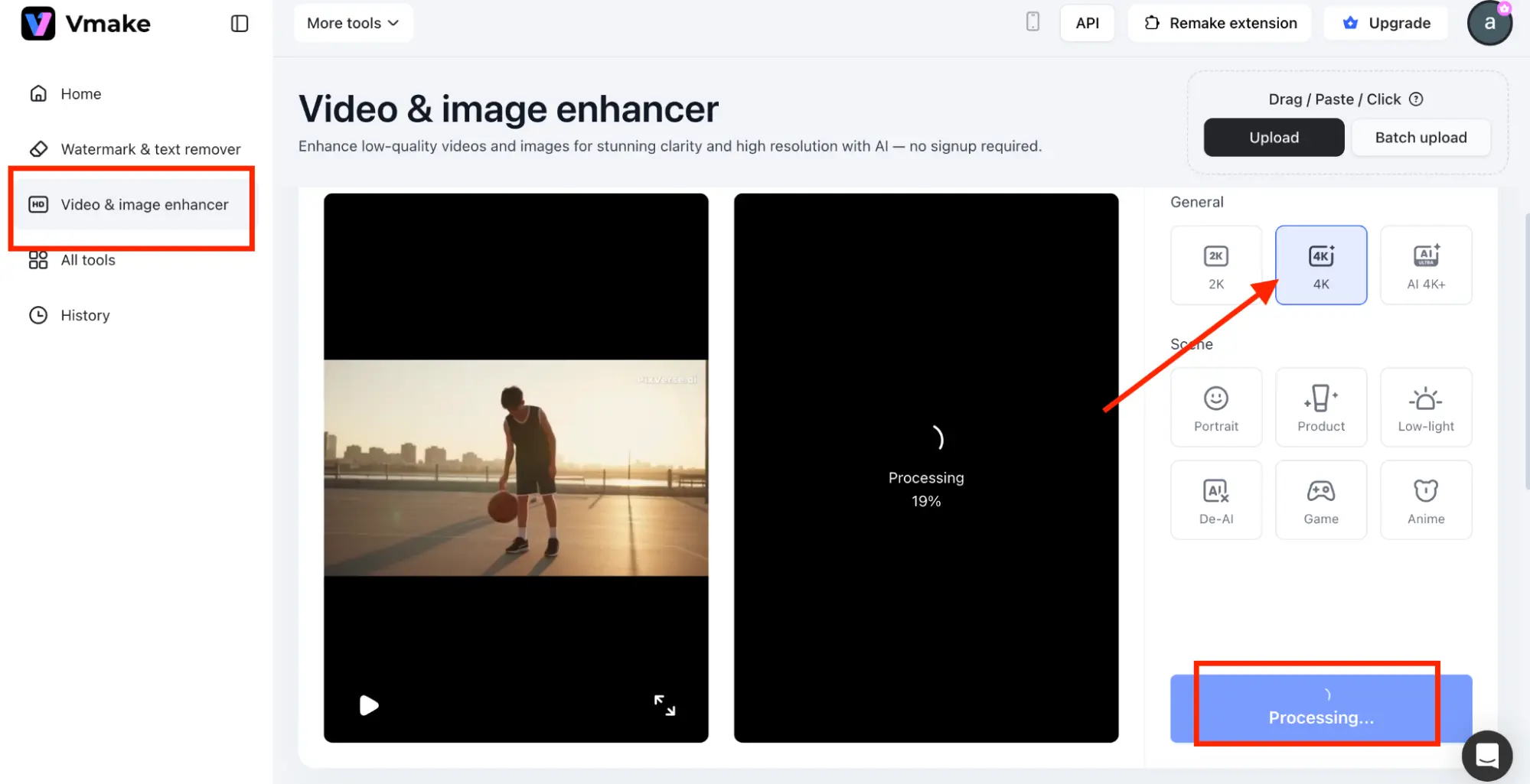 Vmake keeps the process simple. You don’t need to adjust complex settings or understand editing tools. With just one click, you can enhance your video and instantly see better results.